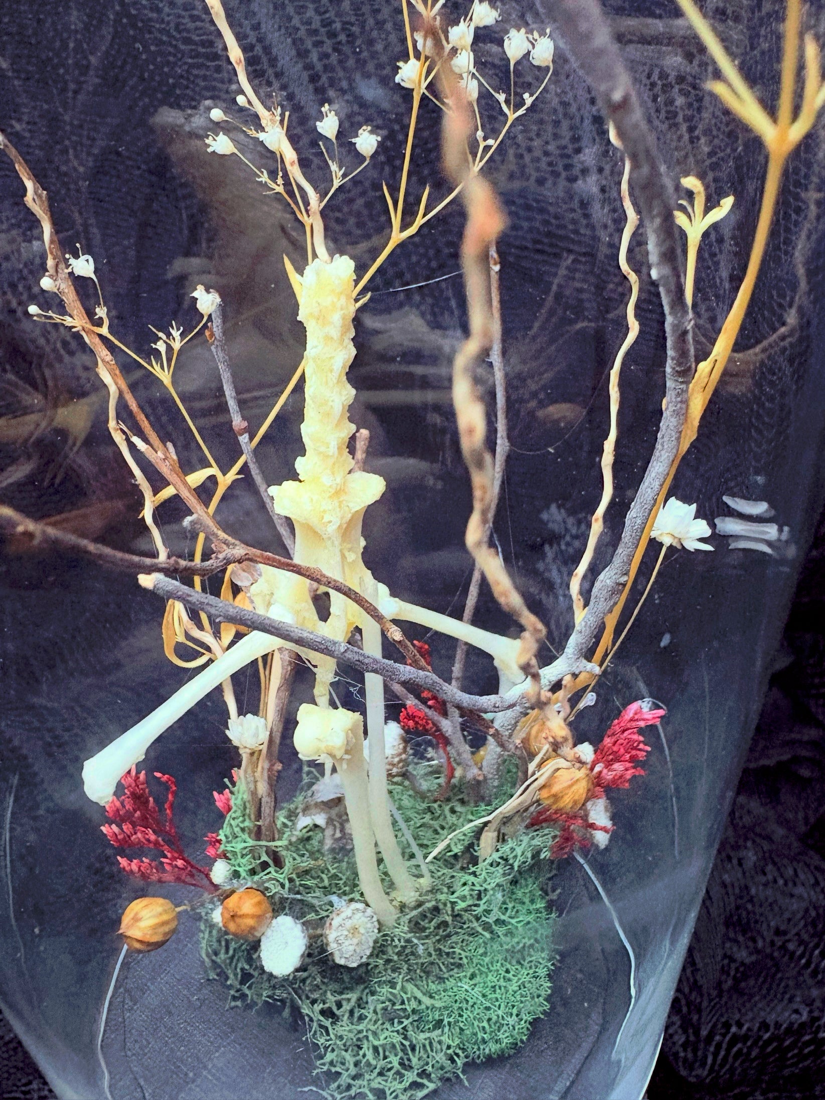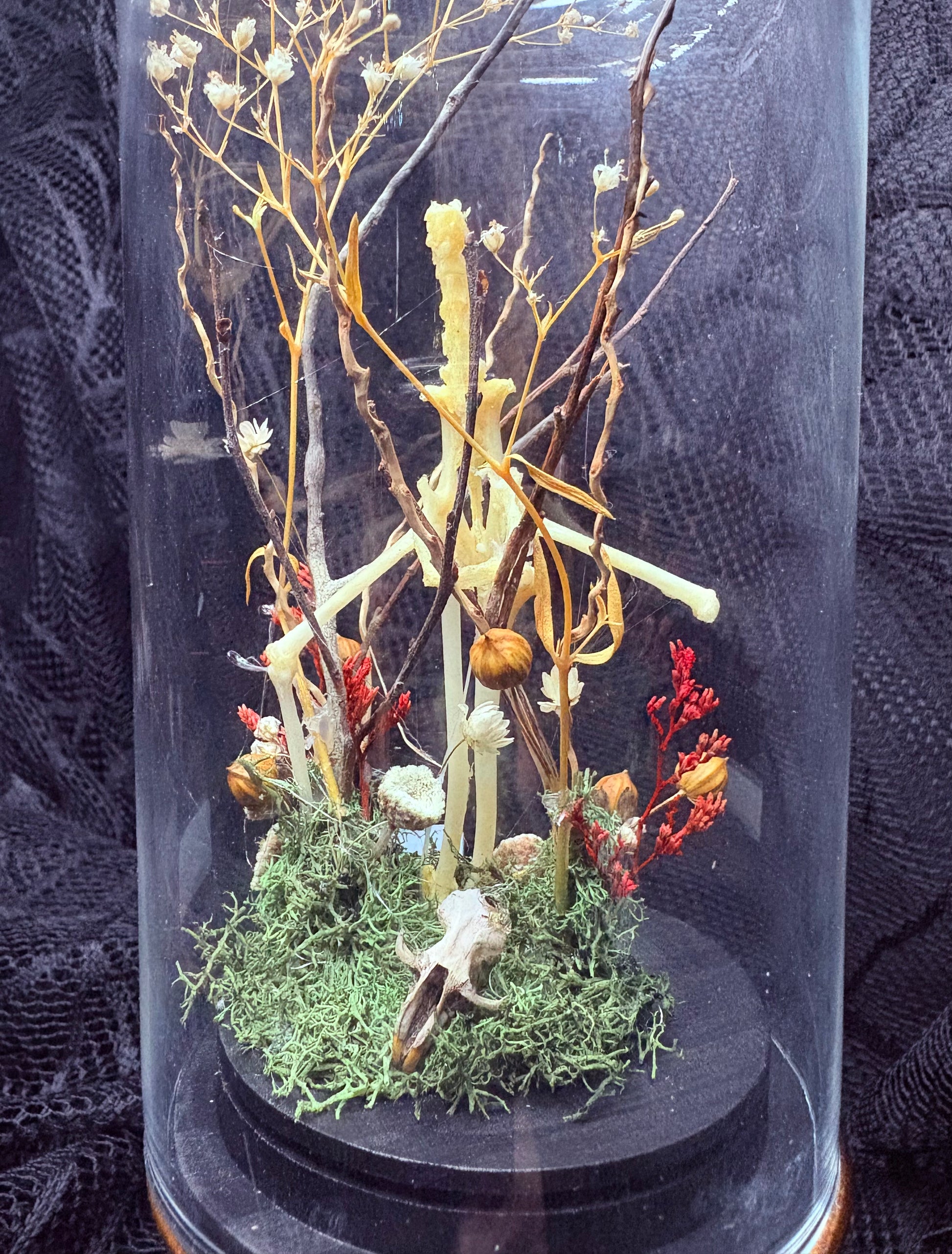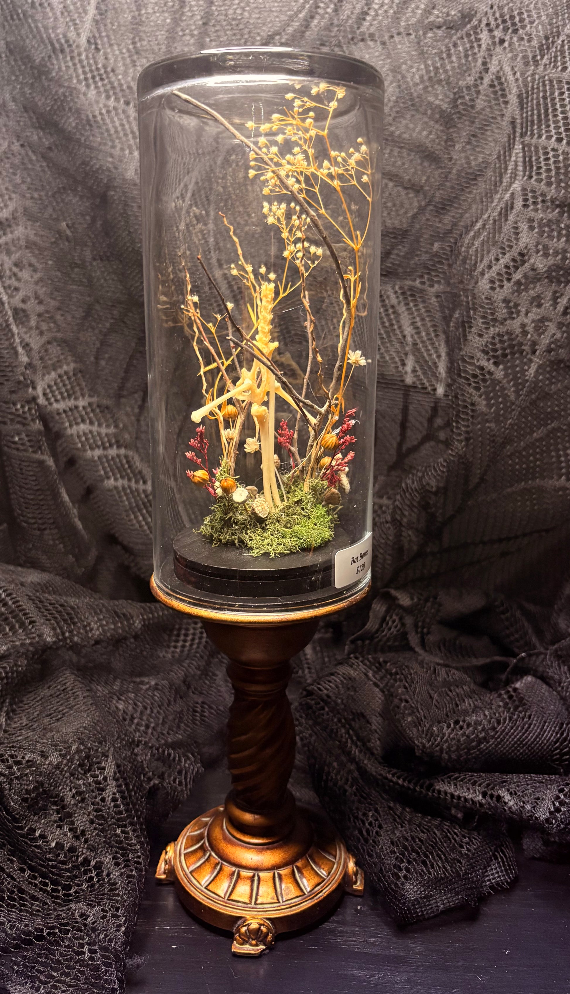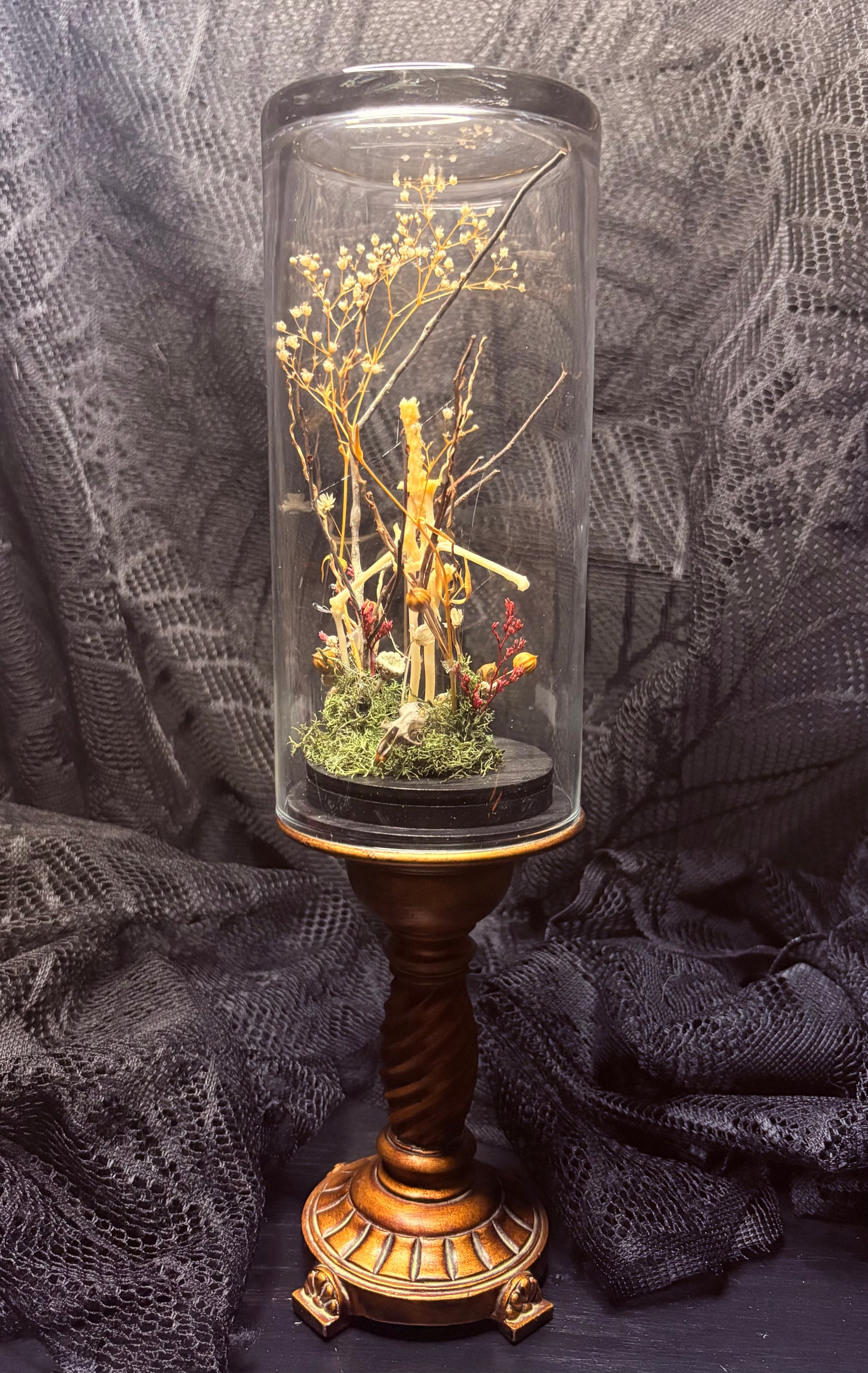 In a medium glass cloche with gold stand